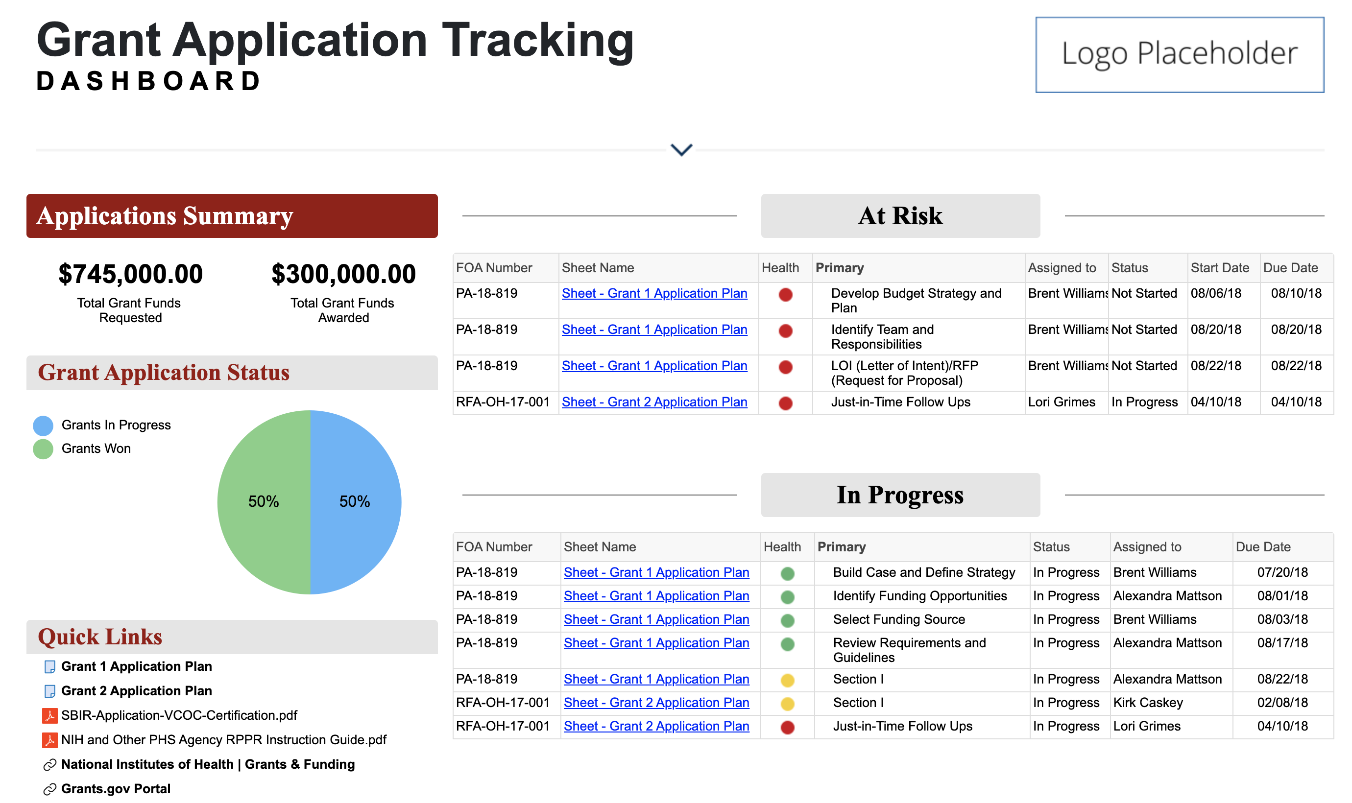 - Monitor open and at risk tasks critical to completing grant applications across your department